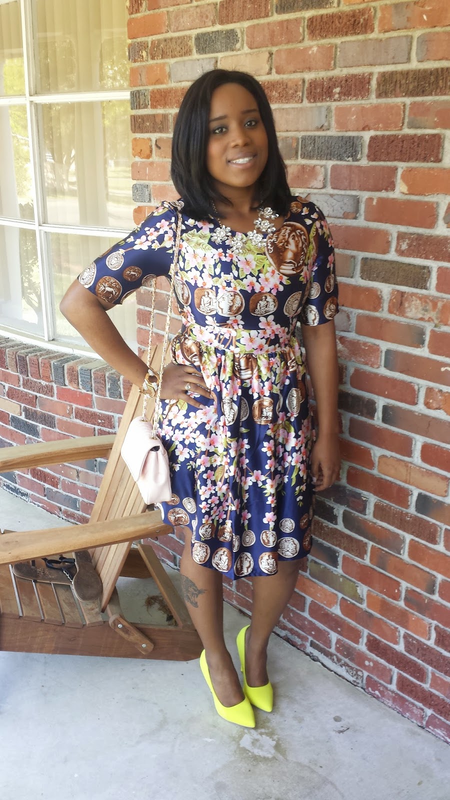 This neon pump that I ordered from Go Jane added the right amount of spunk and brightness that I needed to bring this dress out. The reason I chose to wear these neon pumps was because the splashes of green leaves that are presented in the dress and it worked out perfectly. Another thing that I absolutely loved about this dress was the material; it was very silk liked and that was a major plus in my book. I also paired this look with a pink cross body bag that I got while thrifting at Consign Charleston. This bag reminds me of the Chanel bags that I see everyone carrying around and that is what drew me to it.