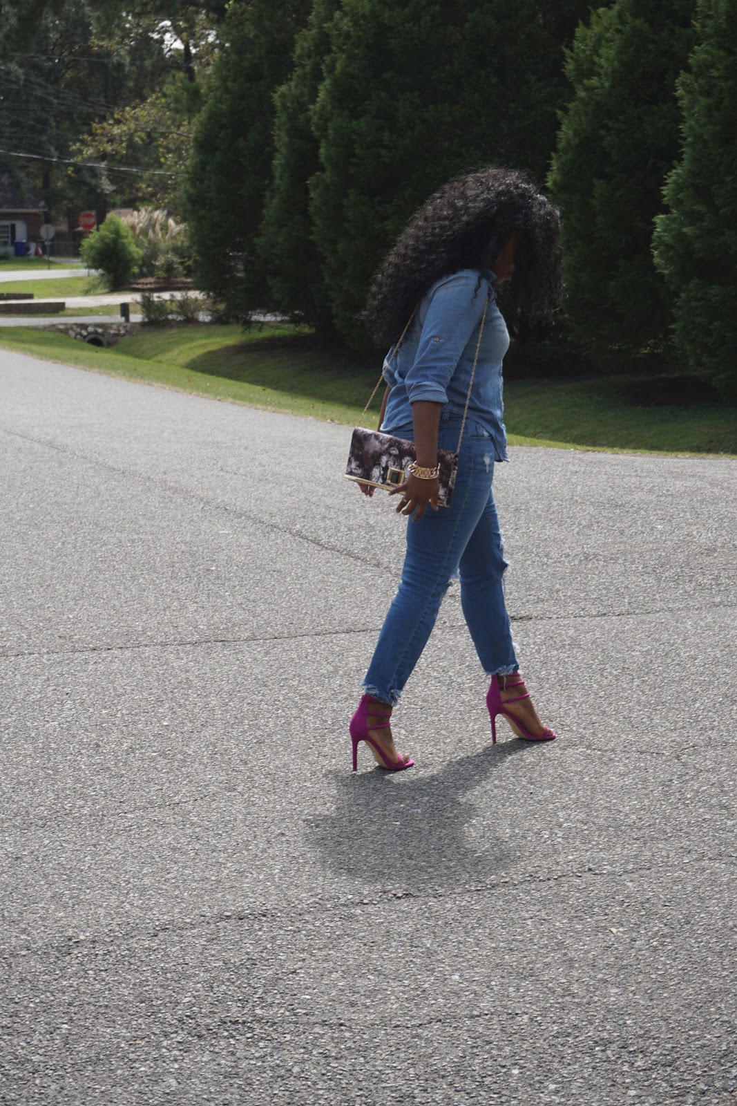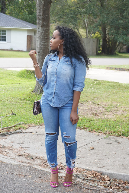 I choose to dress it up with some ankle distressed jeans and a simple buttoned down top. I also added a pop of color with my magenta opened toe heels, with a floral clutch.
